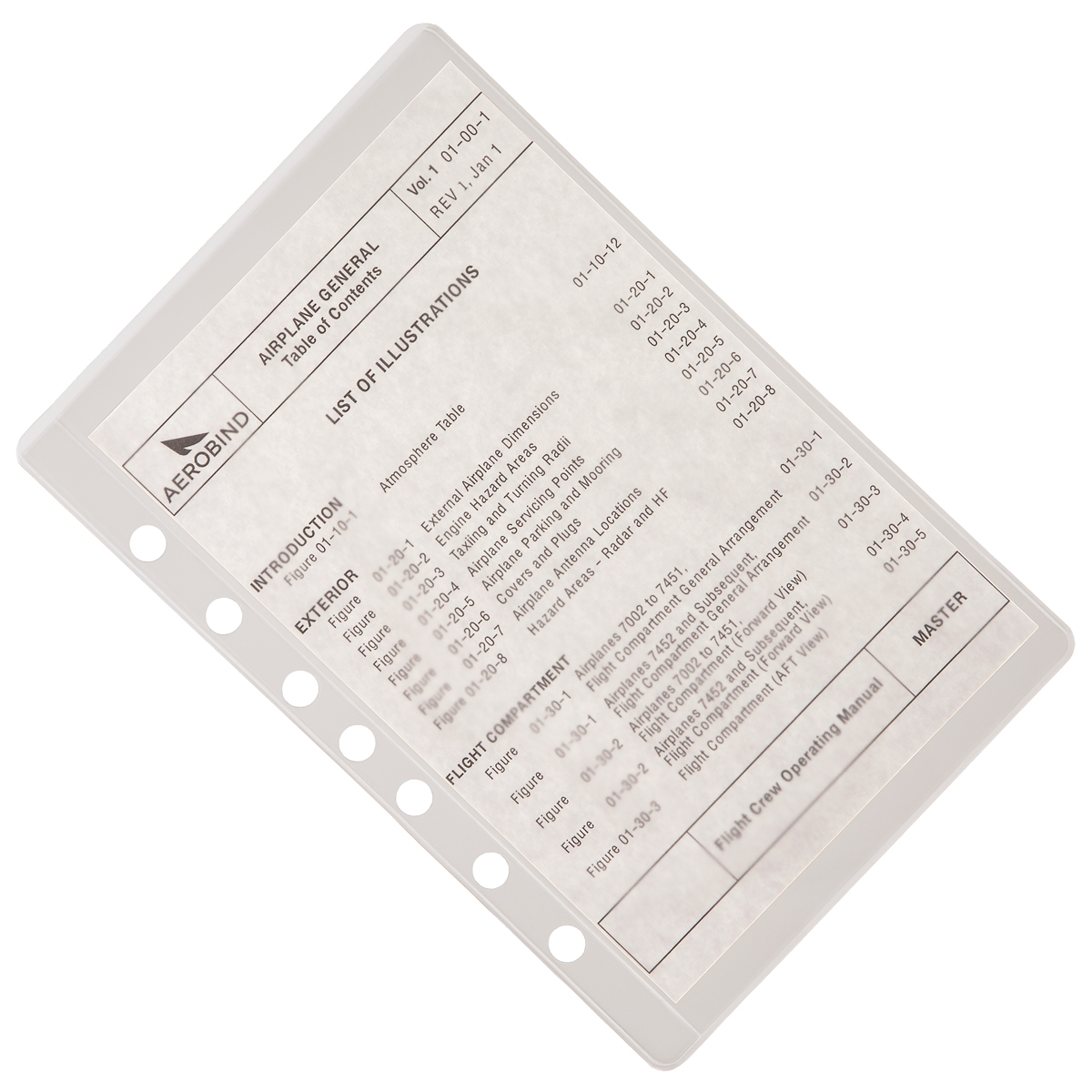 Aerobind makes it easy to print, punch, and bind your entire QRH or pilot checklist. But maybe you just need a single page of revisions or to bind a single manual for a simulator. These vinyl sheet protectors are tested and trusted by the aviation industry for their reliability and ease of use. Our 7 hole sheet protectors are great for inserting pages into a Jeppesen 7 hole binder or Boeing QRH. These sleeves make great Jeppesen chart protectors, and are perfect for replacing flight crew checklists when used with our Aeroflex Checklist Rings. Need a different hole pattern? Aerobind also offers 10 hole, 11 hole, and 22 hole protector pockets.